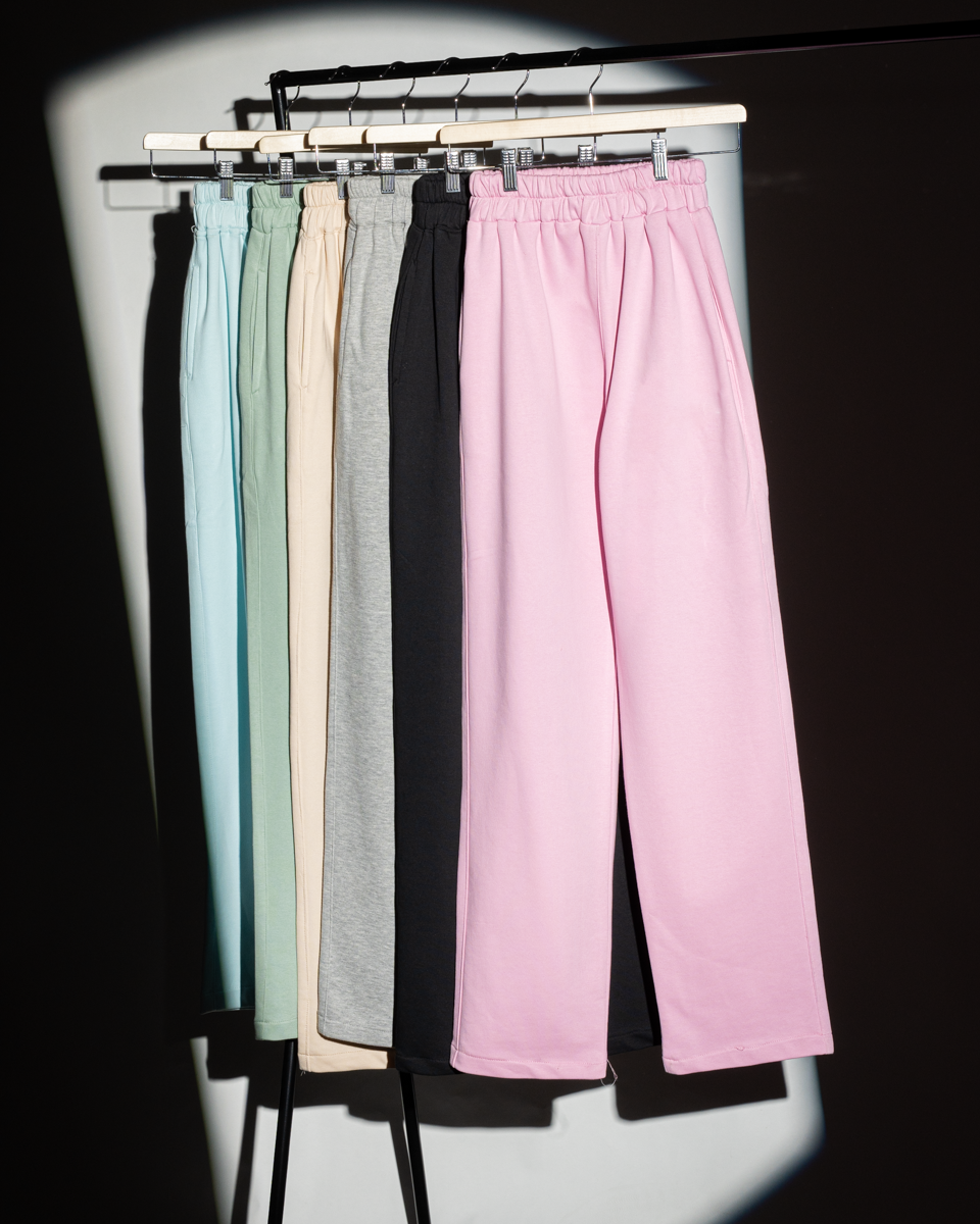 بنطلون حريمي وايد ليج بخامة قطن فرنش تيري 100%، تصميم تريندي شيك ومريح. مثالي للخروج واللبس اليومي وسهل التنسيق.