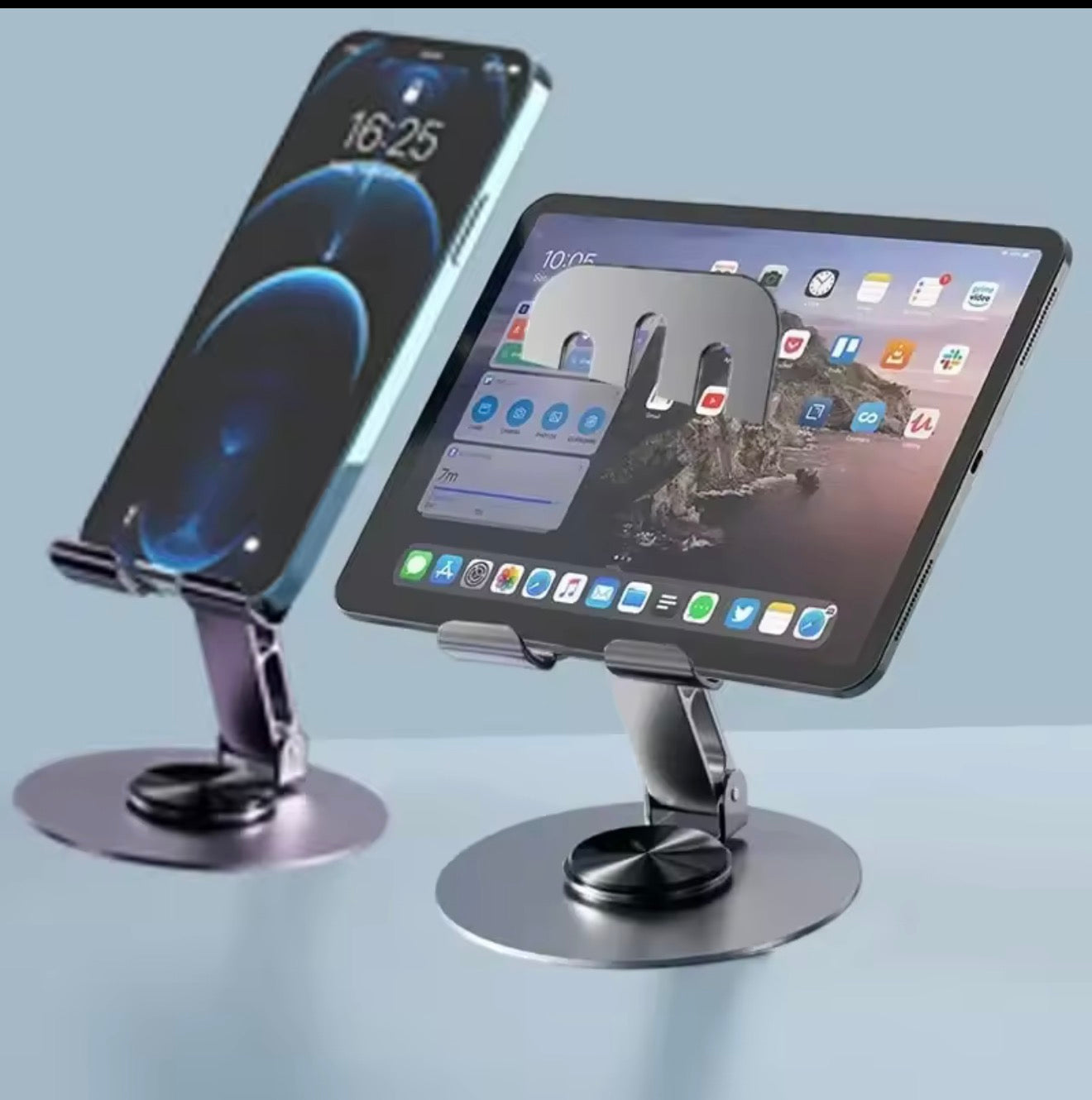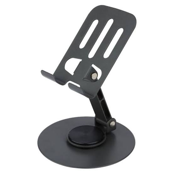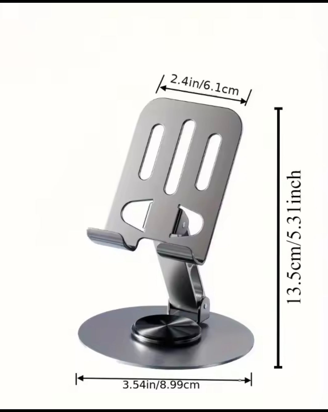 حامل موبايل مكتبي قابل للدوران 360° وتصميم قابل للطي بخامة ألومنيوم متينة. يوفّر تثبيت ثابت وآمن مع وسادات سيليكون مانعة للانزلاق، وزوايا مشاهدة متعددة للموبايل والتابلت حتى 8 بوصة. مثالي للمكتب، الدراسة، ومشاهدة الفيديوهات براحة.