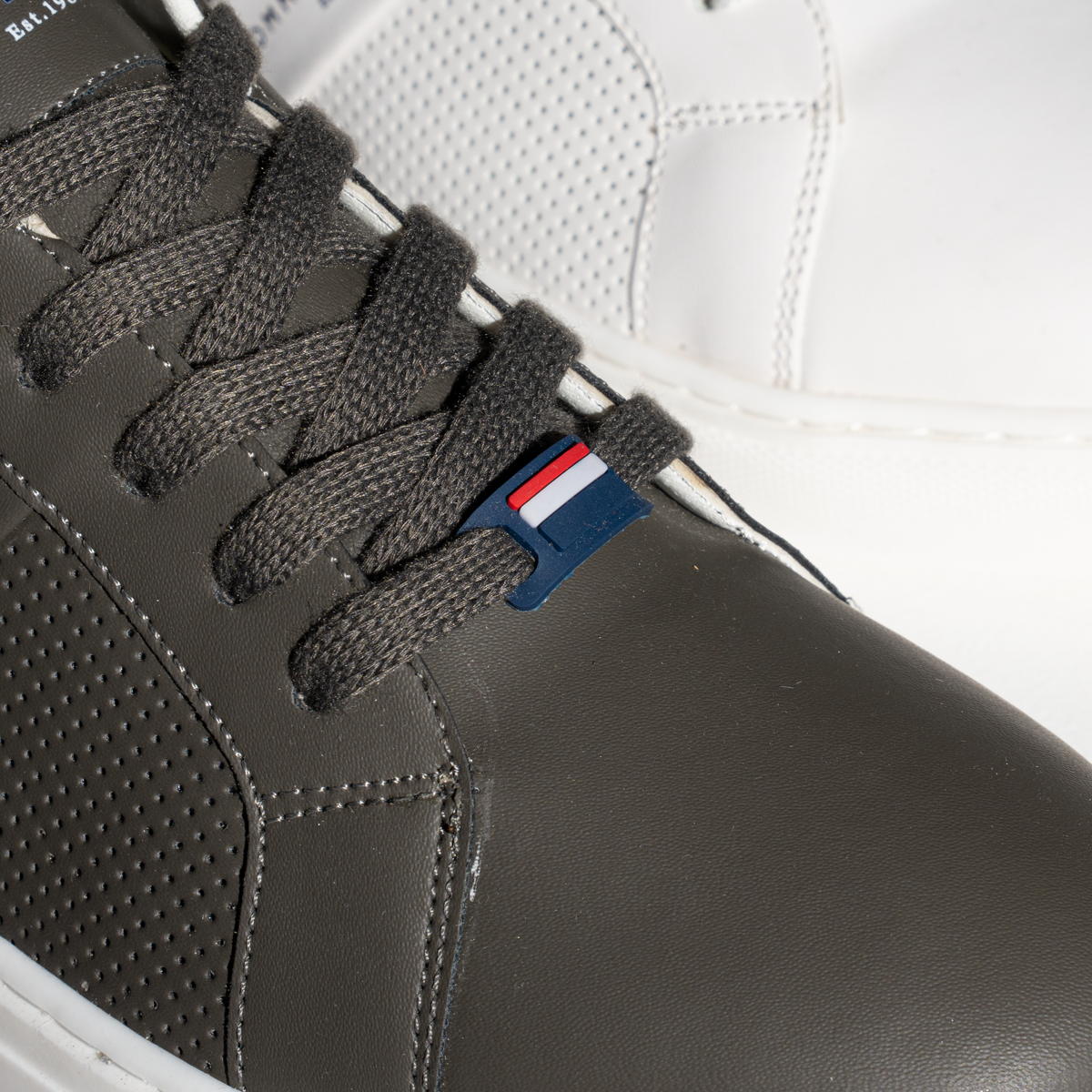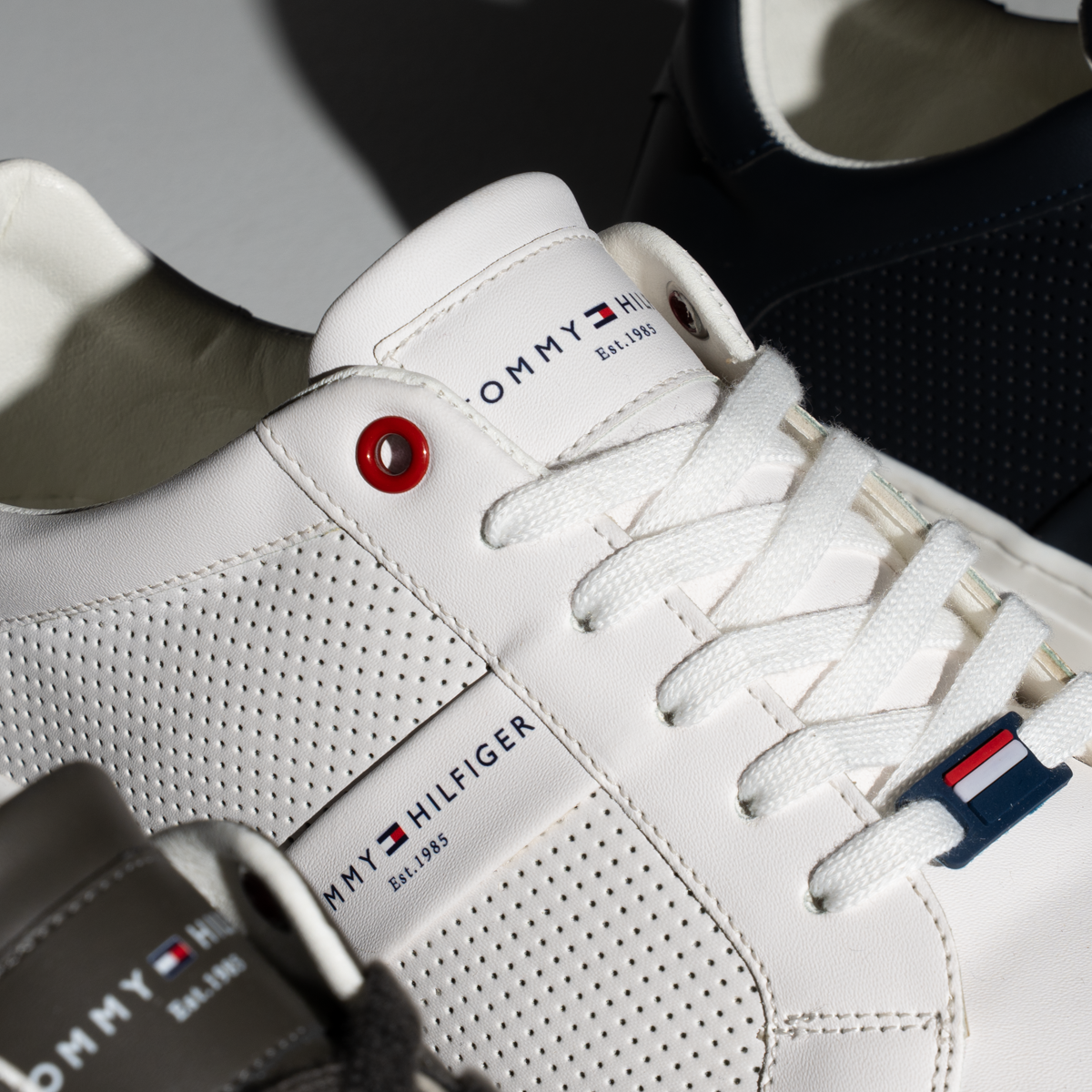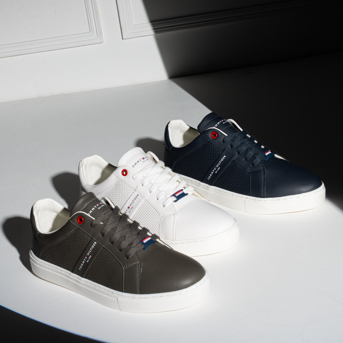 سنيكر تومي رجالي بخامة جلد مستورد، بطانة مرنة، وفرش طبي مريح. نعل مطاطي ثابت وتصميم منخفض يناسب الخروجات واللبس اليومي.