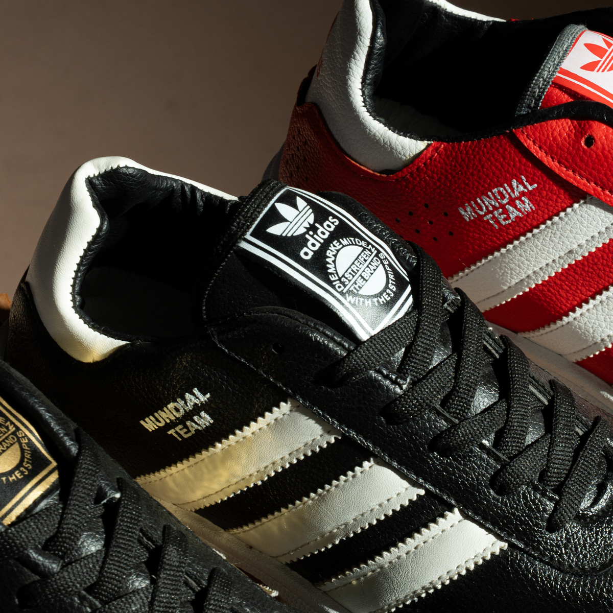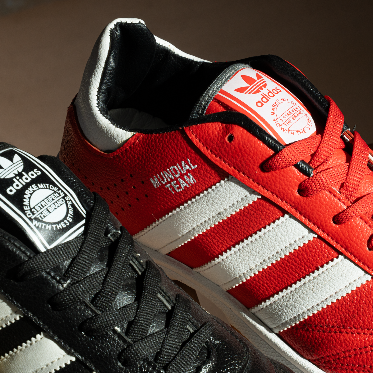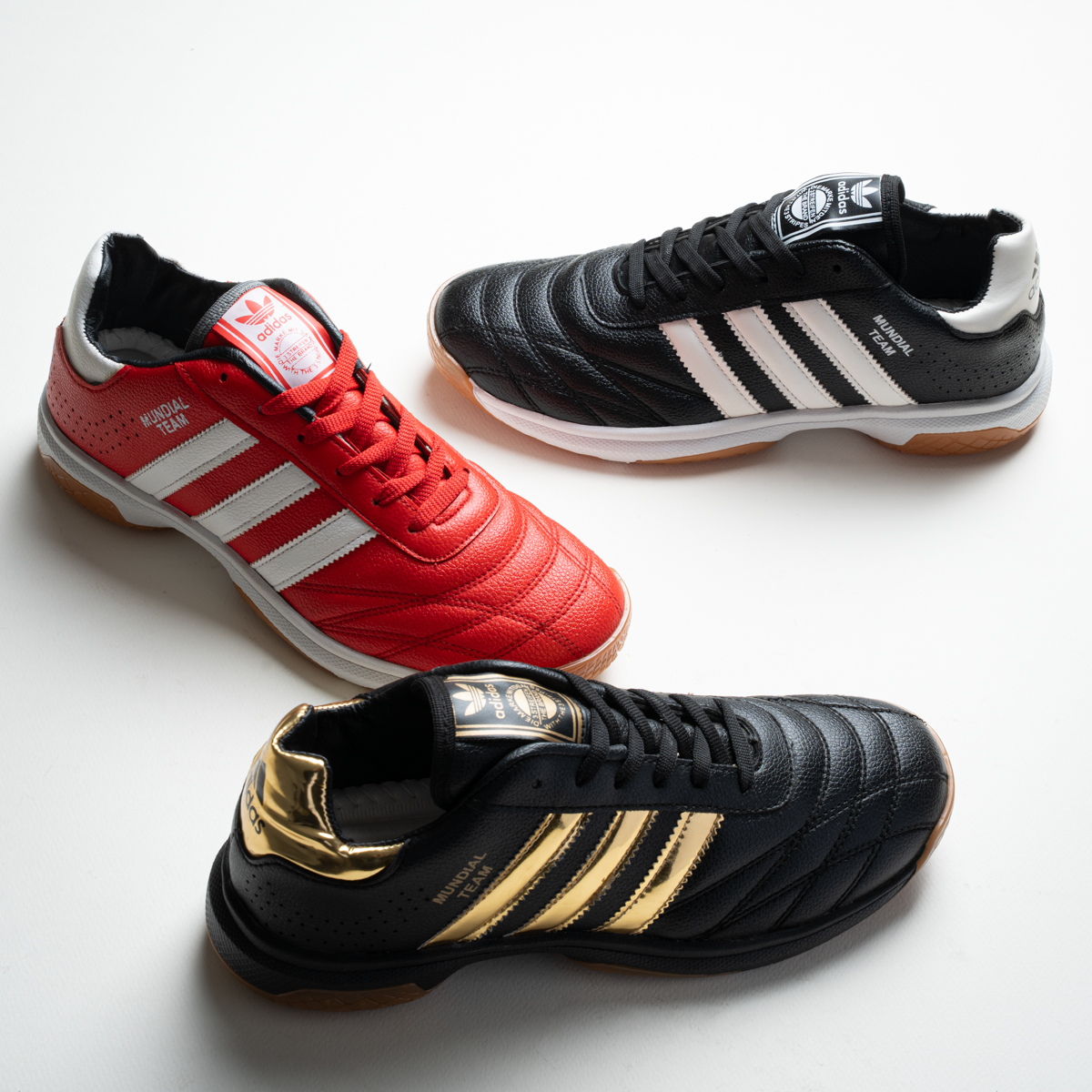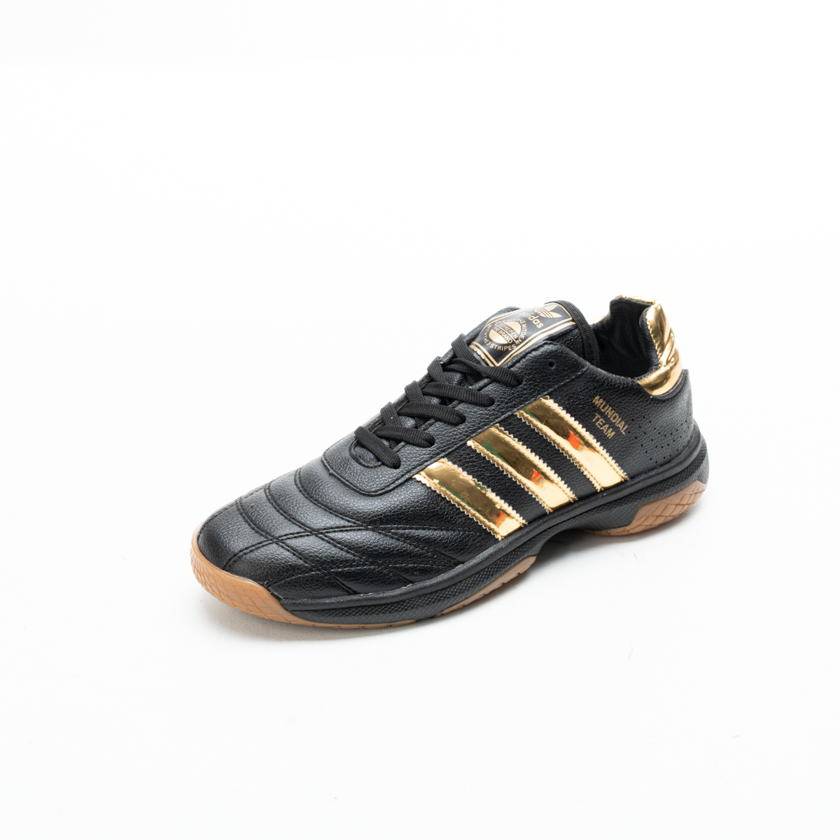 كوتشي أديداس مونديال تيم بخامة جلد مستورد ونعل PU خفيف مرن، مناسب لكرة الصالات والجيم والاستخدام اليومي مع فرش طبي مريح.